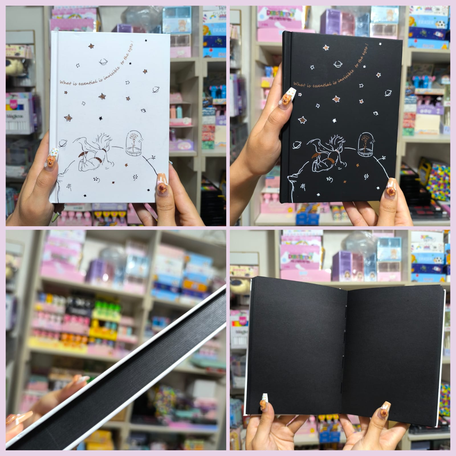 Agenda pasta dura con detalles en foil. Medidas aproximadas: 19cm X 13cm. Trae aproximadamente 125 hojas completamente negras.